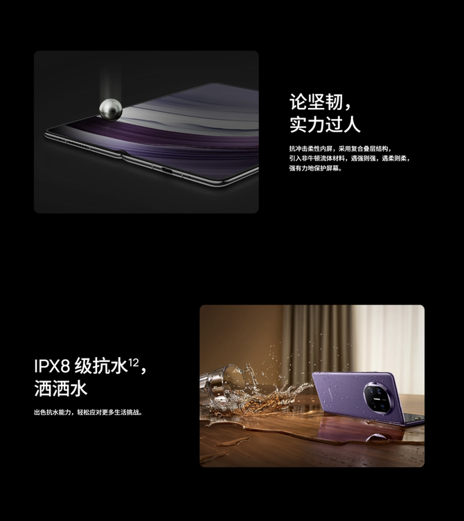 同时,其搭载的抗冲击柔性内屏采用复合叠层结构,引入非牛顿流体材料,具备“遇强则强、遇柔则柔”的特性,在受到外力快速冲击时能瞬间变硬,保护屏幕不受损伤。此外,华为MateX5还支持IPX8级抗水,即使遭遇水洒、饮料泼溅或突如其来的暴雨,也能从容应对,让用户使用更安心。