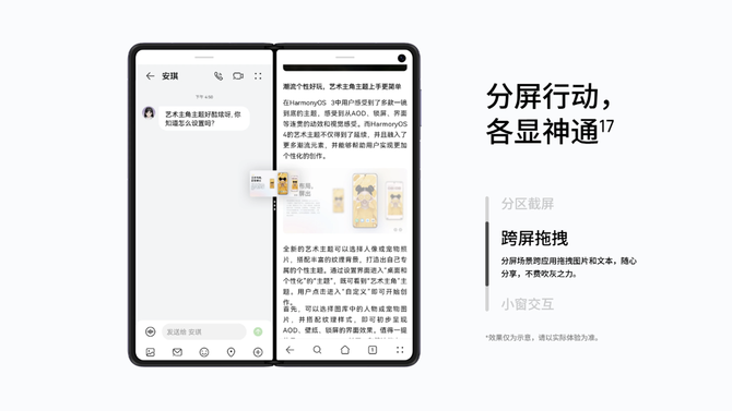 智慧分屏功能让多任务处理变得轻松简单,配合华为MateX5的超大内屏,可将屏幕分割成多个工作区,同时运行不同应用,无需频繁切换应用,大大提高工作和学习效率。